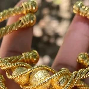 Bangles bracelet in gold colour is a classic and versatile piece of jewellery. It consists of multiple thin, circular bands that can be worn individually or stacked together on the wrist. The bracelet is usually made of high-quality gold plated 24 k, which gives it a beautiful and luxurious look.